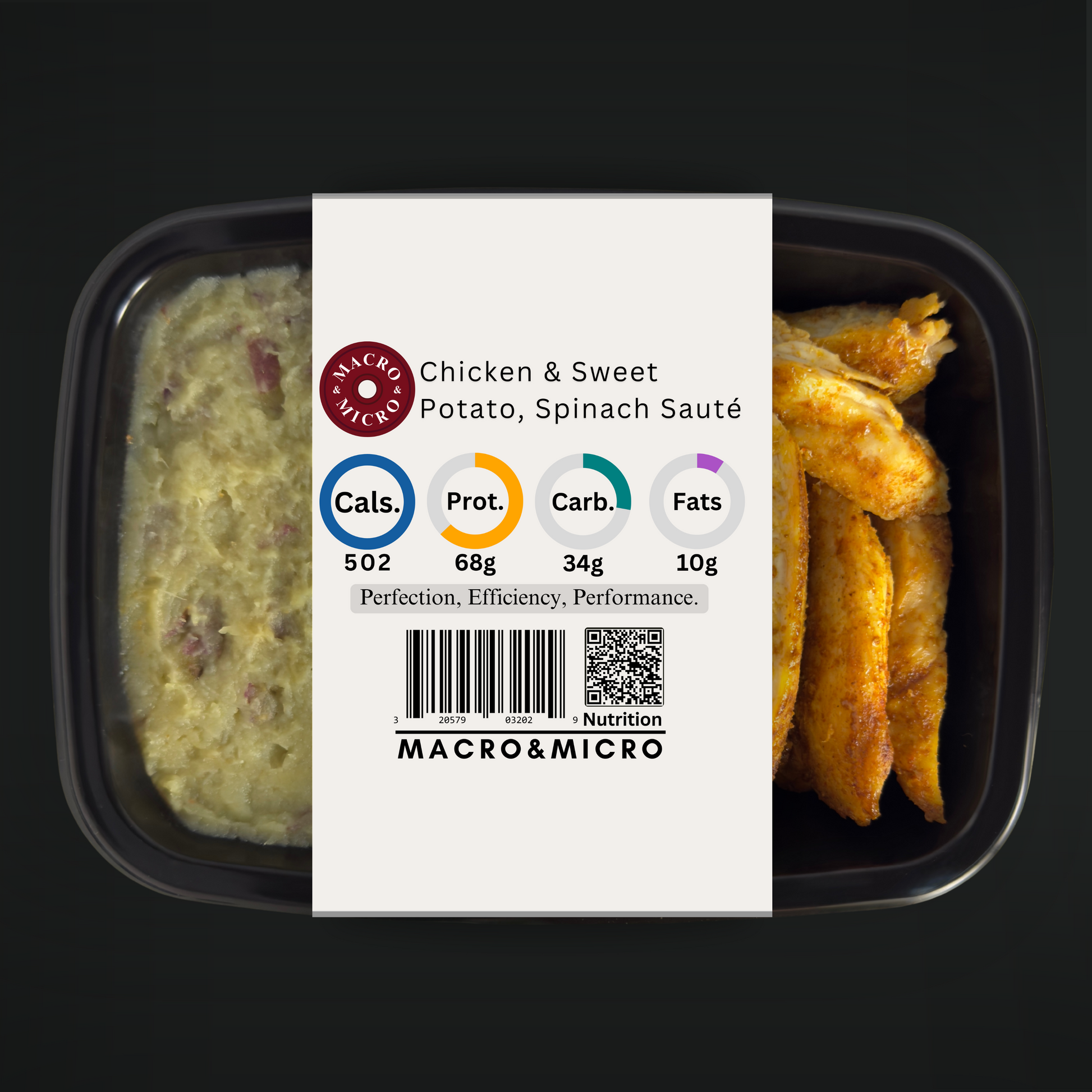 Savor tender chicken breast paired with naturally sweet potato and nutrient-rich spinach, enhanced with a hint of butter for a deliciously satisfying experience.